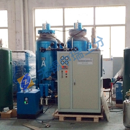 液氮機(jī)設(shè)備是根據(jù)變壓吸附原理,采用高品質(zhì)的碳分子篩作為吸附劑,在一定的壓力下,從空氣中制取氮?dú)狻=?jīng)過凈化干燥的壓縮空氣,在吸附器中進(jìn)行加壓吸附、減壓脫附。由于動(dòng)力學(xué)效應(yīng),氧在碳分子篩微孔中擴(kuò)散速率遠(yuǎn)大于氮,在吸附未達(dá)到平衡時(shí),氮在氣相中被富集起來,形成成品氮?dú)狻H缓鬁p壓至常壓,吸附劑脫附所吸附的氧氣等其它雜質(zhì),實(shí)現(xiàn)再生。一般在系統(tǒng)中設(shè)置兩個(gè)吸附塔,一塔吸附產(chǎn)氮,另一塔脫附再生,通過PLC程序自動(dòng)控制,使兩塔交替循環(huán)工作,進(jìn)行氧氮吸附分離,從而得到合格的氮?dú)猓龠M(jìn)入風(fēng)冷無油循環(huán)壓縮機(jī)和液化設(shè)備,使氮?dú)鈴臍鈶B(tài)變換成液態(tài)得到液態(tài)氮。